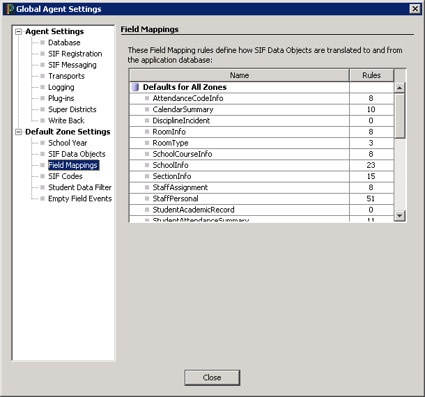 The Field Mappings panel lists each SIF Data Object supported by the Agent. The number of "Rules" for any given object reflects the number of elements that object encompasses. For example, the StudentPersonal object has many elements, including name and contact information, language, ethnicity, and many other identifiers.