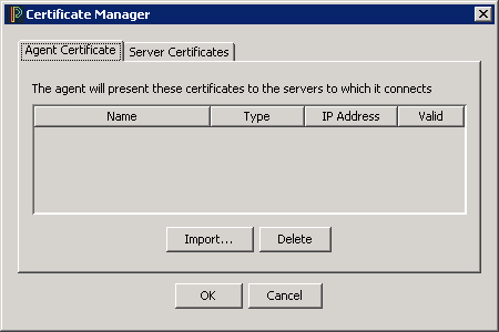 The public key certificate for any ZIS that the agent is connecting to needs to be loaded into the Server Certificates section. This can be done by clicking the Import button on the Server Certificates page of the Certificate Manager (shown in the previous section).
