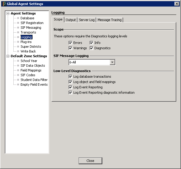 The Scope tab includes options for settings for the scope of diagnostic logging; SIF message logging; and low-level diagnostics.