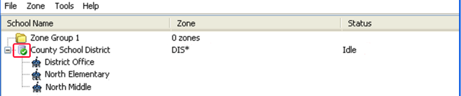 Although the PowerSchool SIF Agent is designed to run unattended, the Console can provide a snapshot of the activity on each zone and alert you to errors that may require attention. In the Console's main window, general status information is provided through a condition icon (displayed with the district, school, or zone name) and a status message (displayed in the Status column).