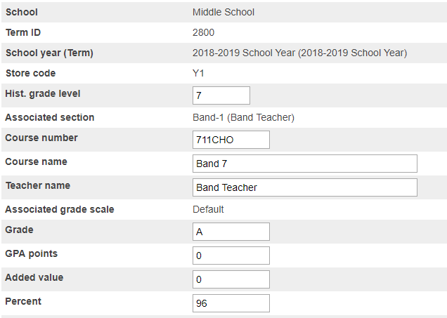 - Determine if the grade is associated with the correct class. If this is not correct, then the grade will not be used. Grades can only be used for the Course/Section combination they are stored with. If a student enrolled in the different sections of the same course, they need final grades for both sections if they completed both sections. The screenshot below shows the Associated section as Band-1.