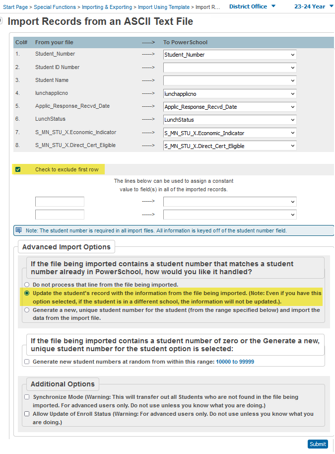 In the Advanced Import Options section, select the ‘Update the student's record with the information from the file being imported’