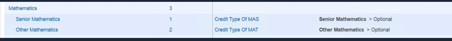 - Provincial Reporting: Because the order in which the credit is applied is based on the graduation plan category order not the credit type list order and since Senior Mathematics is first on the planner, it follows MAS -> Senior Math and assigns the credit to Senior Math. MAT is ignored.