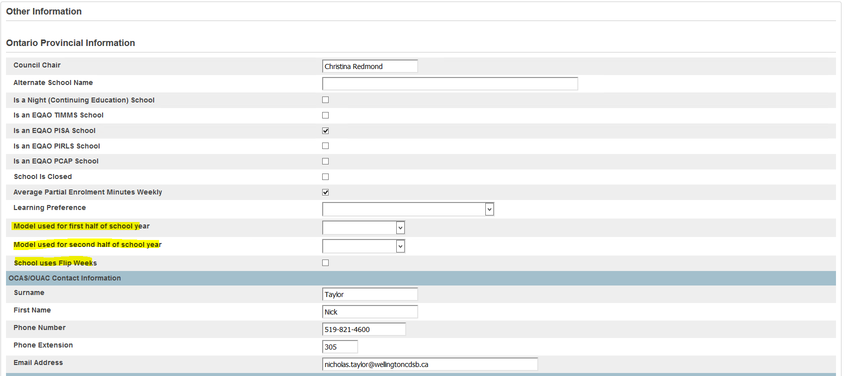 Boards/schools are expected to define the model used by each school for both Semester 1 and Semester 2. Those values are saved by year and are expected to be set every year. The default values are blank ( i.e., default to Conventional Model).