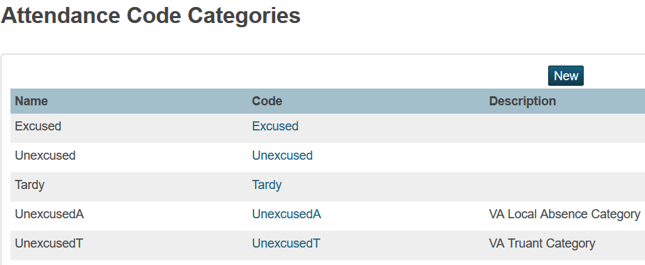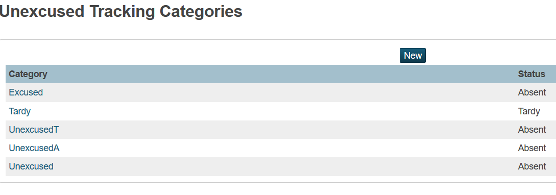 Click New and create a category with a name and code of UnexcusedT. This must be defined to record Truant unexcused absences.
