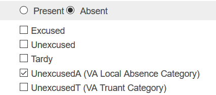 When assigning an Unexcused Absence attendance code, be sure that the student is assigned codes from one unexcused category only. If a student is marked with an UnexcusedT (truant absence), but then information is received that deems the student locally absent (UnexcusedA), the attendance must be updated to indicate to which category the absences recorded will apply. The VDOE category definitions are as follows: